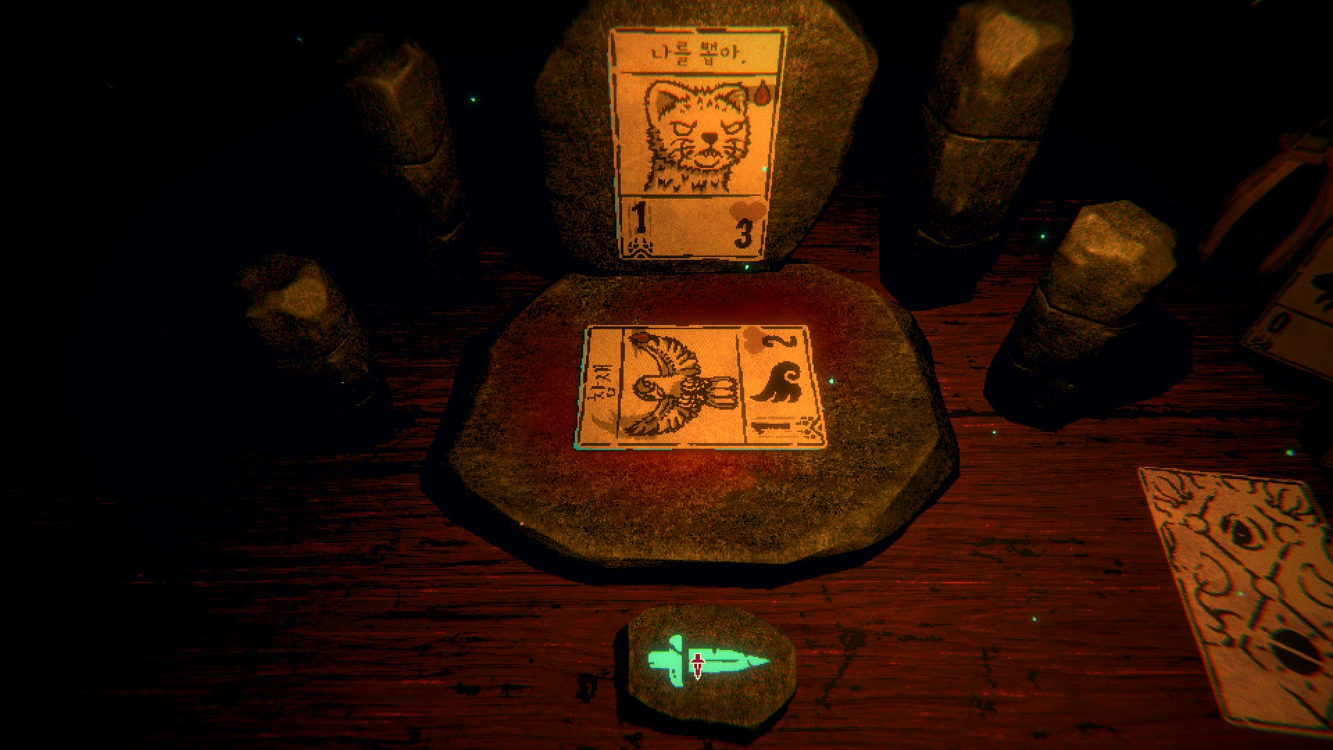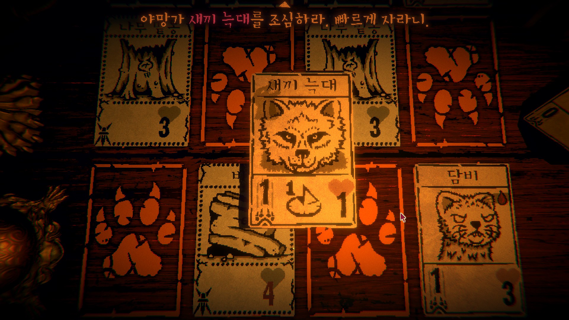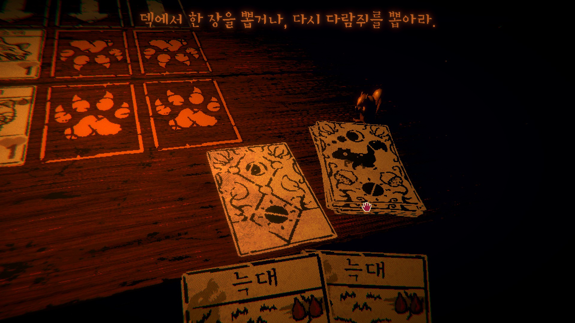 처음엔 규칙이 단순해서 금방 질릴 거라고 생각했는데 게임이 휙휙 바뀐다. 플레이 도중 여길 탈출할 방법에 대해 말을 걸어오는 카드들. 어두컴컴한 오두막은 긴장의 끈을 놓지 못하게 만든다. 여기에 맛깔나는 마스터링이 더해져, 플레이어를 이 세계에 흠뻑 빠뜨린다. 왜 카드가 말을 할 수 있는 거지? 여길 탈출하려면? 어떻게 해야 노인장을 쓰러뜨릴 수 있을까 등등 머릿속이 뱅뱅 돈다.