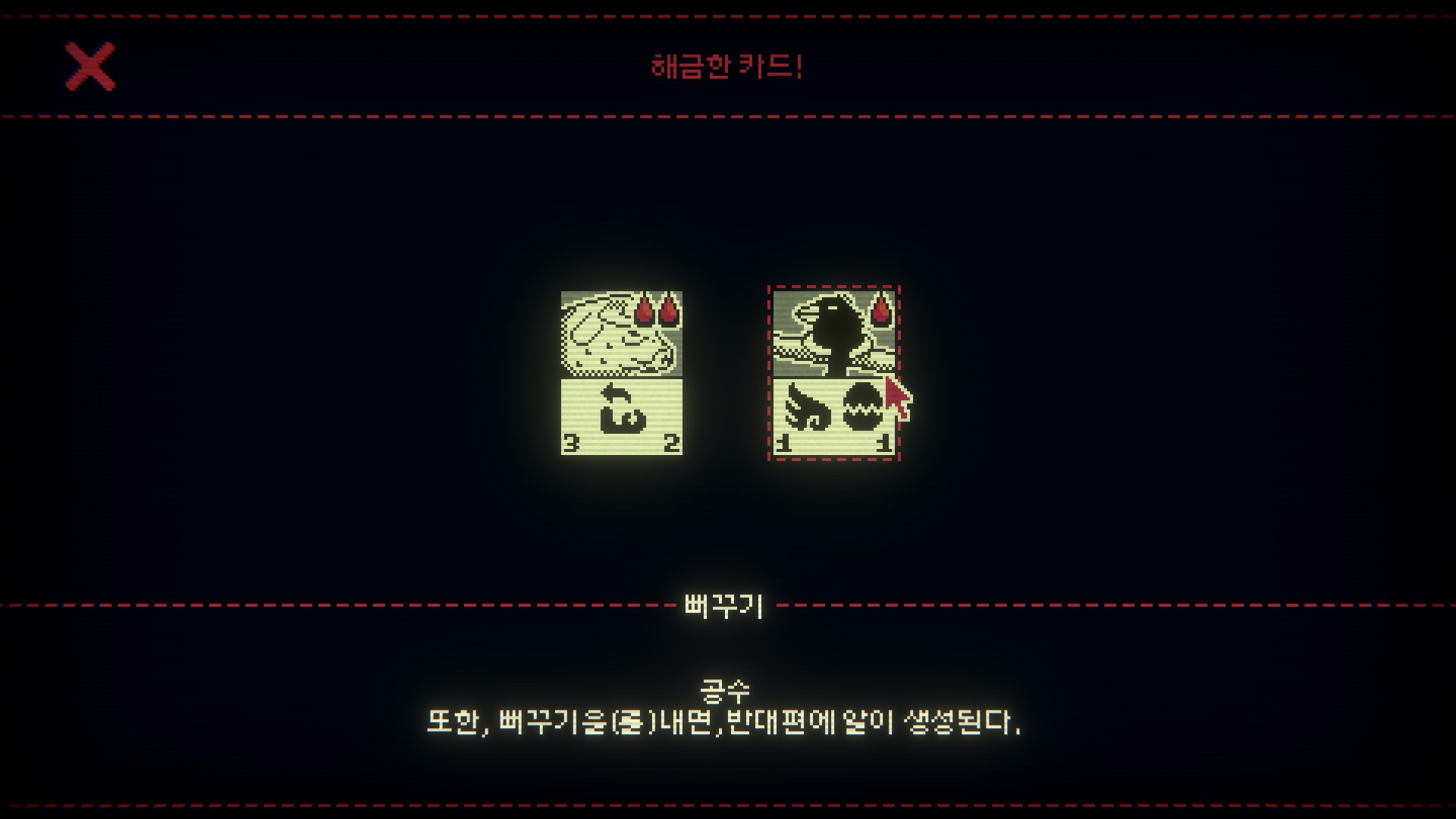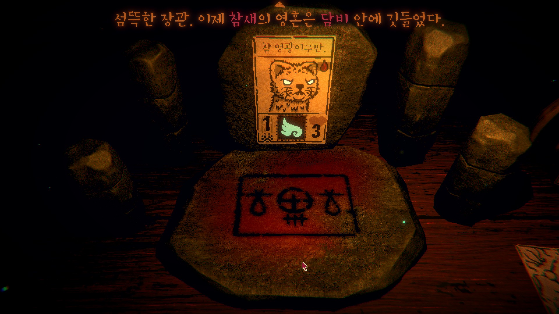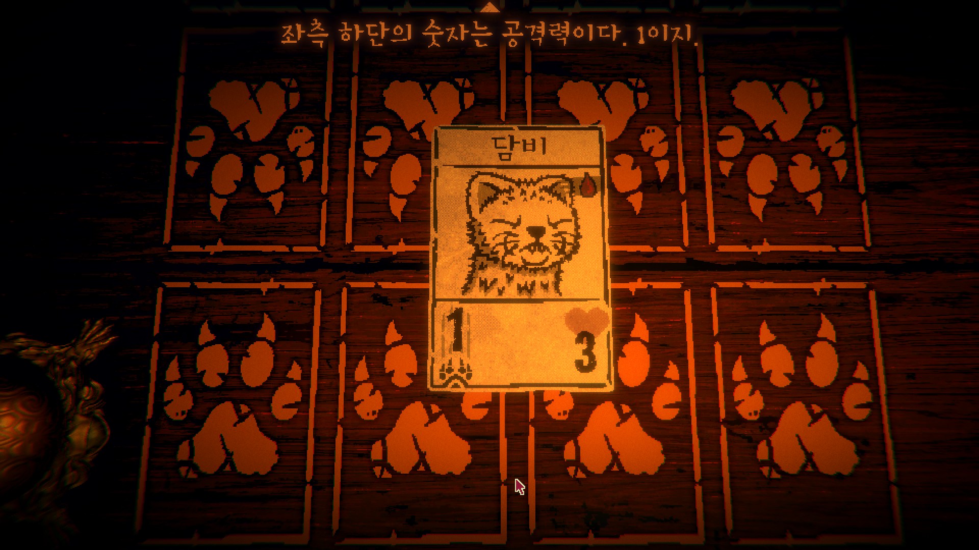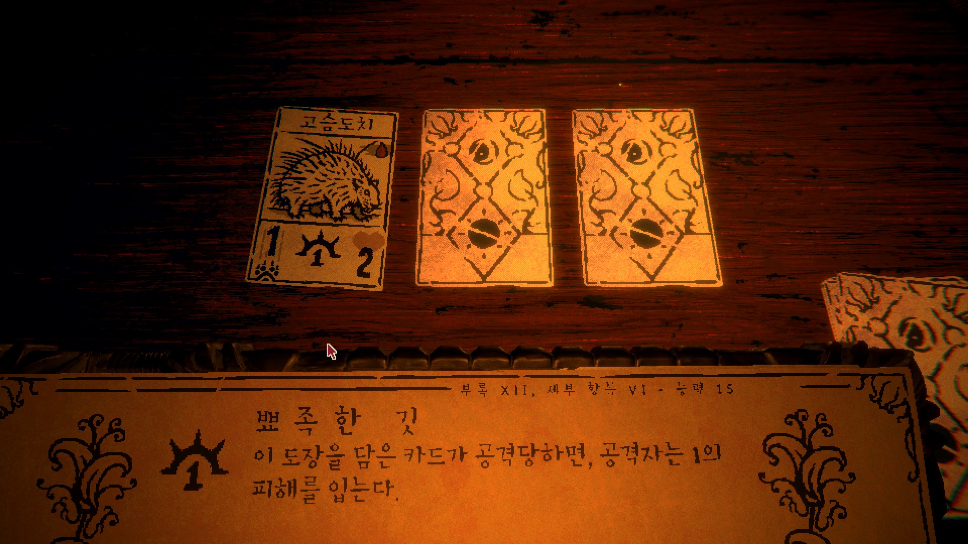 처음엔 규칙이 단순해서 금방 질릴 거라고 생각했는데 게임이 휙휙 바뀐다. 플레이 도중 여길 탈출할 방법에 대해 말을 걸어오는 카드들. 어두컴컴한 오두막은 긴장의 끈을 놓지 못하게 만든다. 여기에 맛깔나는 마스터링이 더해져, 플레이어를 이 세계에 흠뻑 빠뜨린다. 왜 카드가 말을 할 수 있는 거지? 여길 탈출하려면? 어떻게 해야 노인장을 쓰러뜨릴 수 있을까 등등 머릿속이 뱅뱅 돈다.
