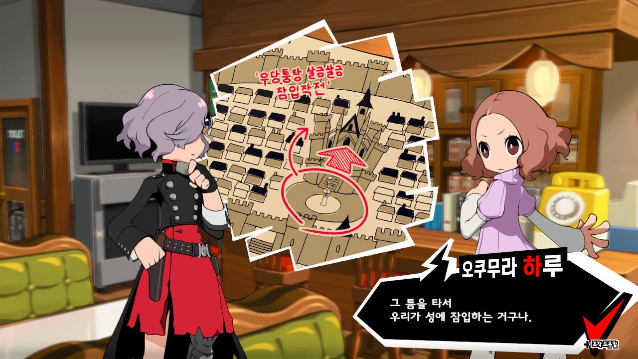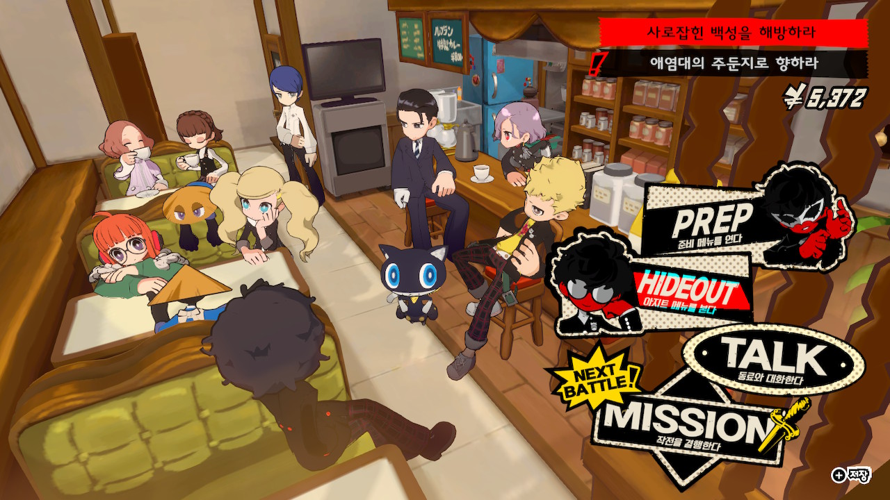 동료와의 대화 또한 아지트에서 이루어진다. 마음에 드는 캐릭터와 코옵(커뮤니티)을 형성했던 본편과 달리, <P5T>는 정해진 대화만 볼 수 있고, 선택지에 따라 이야기가 바뀌지도 않는다. 비주얼 노벨의 몇 안 되는 장점을 포기한 셈이다.
