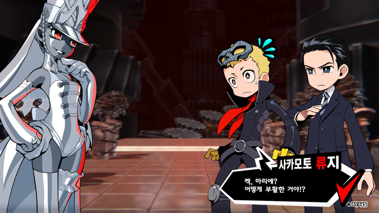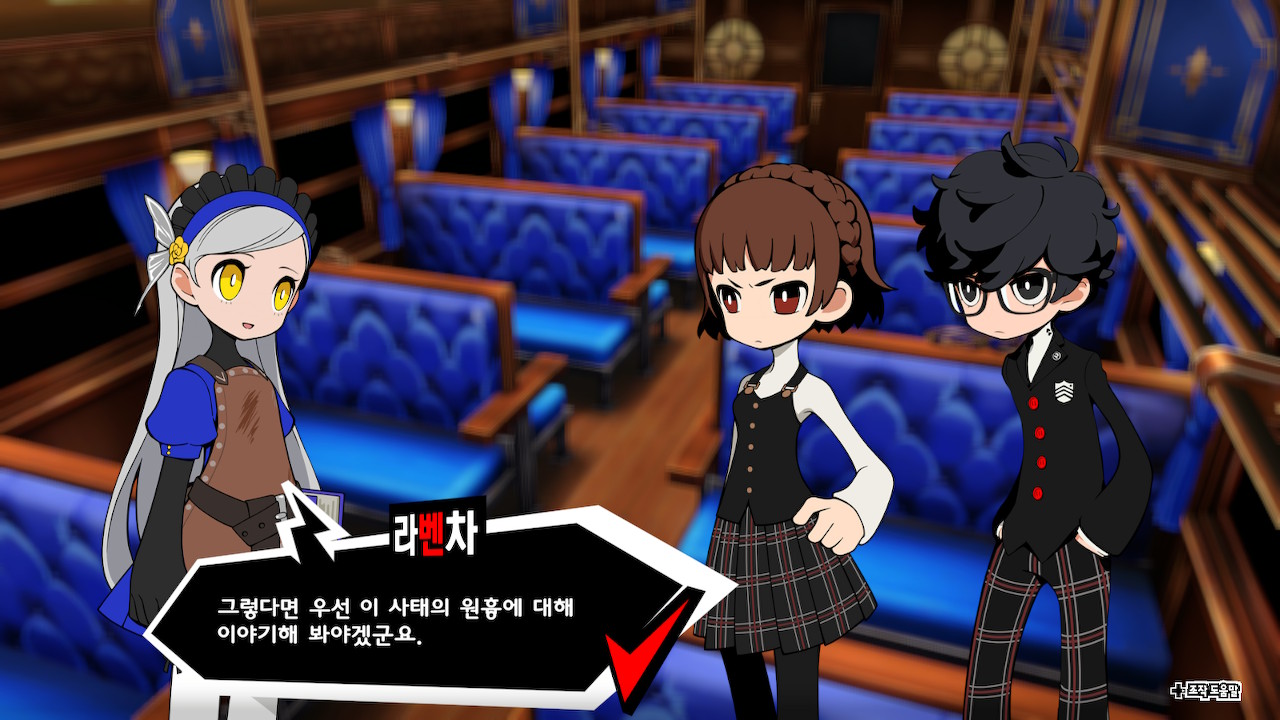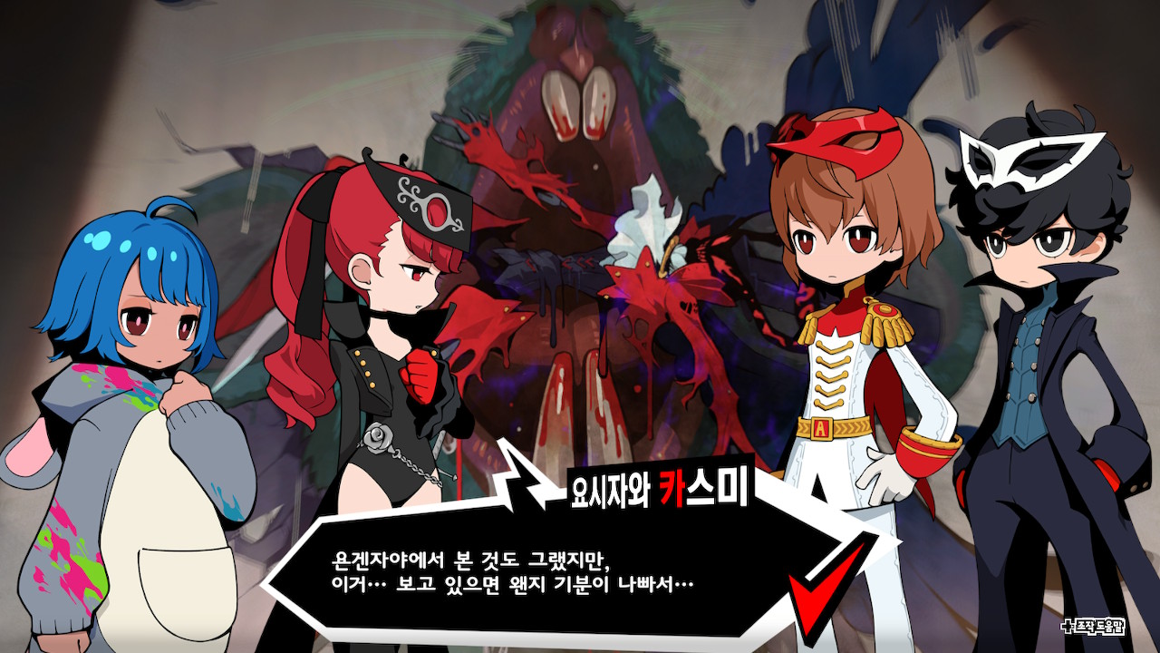 <P5T>의 등장인물은 예외없이 SD 캐릭터로 표현되었다. 처음 스크린샷을 봤을 때 기대감이 없었던 이유가 이것이었다. 지금은 기기의 한계가 뚜렷했던 90년대가 아니다. 모바일 게임도 아니다. 그런데 SD 캐릭터라니, 보나마나 저예산 게임일 게 분명하다.