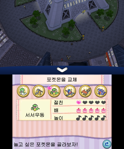 미르시티는 파리를 제대로 구현했는가? 내 대답은 NO다. 파리 특유의 화려함을 어떤 방식으로 구현할 것인가. 일단 인터페이스(UI), 그래픽-디자인 파트를 연이어 살펴볼 필요가 있겠다. 3DS의 듀얼 스크린에서 상단 스크린은 게임 화면(메인 디스플레이)을, 하단 스크린은 인터페이스를 나타낸다. <XY>의 UI는 포켓몬을 육성하고, 싸우고, 교감하는 '포켓몬 퍼스트'를 설계 원칙으로 삼았다. 이것으로 포켓몬에 친근함이 더해졌다.