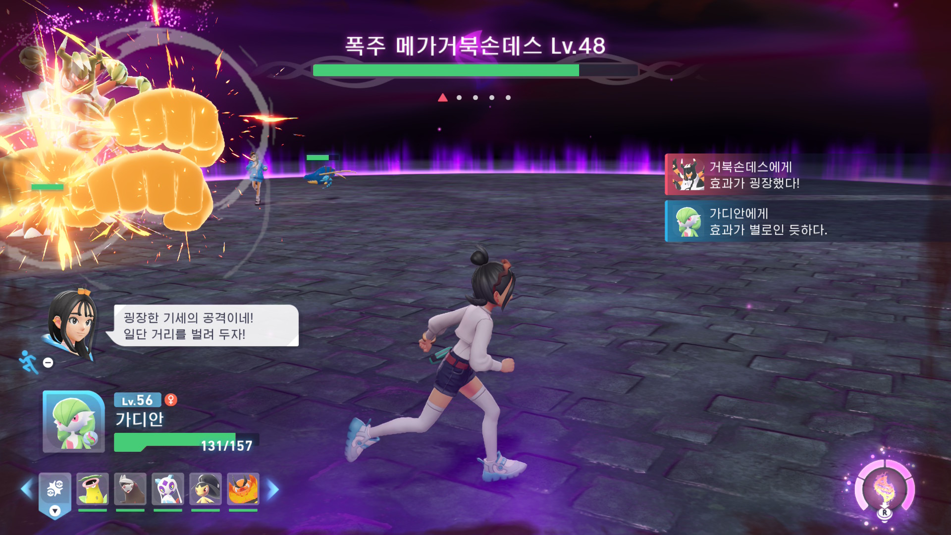 동행은 계속된다. 공존을 얘기하는 작품답게 탐험에서도, 배틀에서도 항상 포켓몬이 함께 움직인다. 내가 움직이는 대로 쫄래쫄래 따라오는 포켓몬의 모습. 턴제에 액션을 한 움큼 집어넣은 듯한 과도기의 액션이다. <ZA>는 확정적으로 쳐맞는 기술(10만 볼트)도 있고, 지진처럼 넓은 범위를 공격하는 기술도 있고, 추적 성능이 강한 일부 돌진기도 존재한다. 기술 설명과 실제 성능이 판이하게 다른 상황에서, 나는 추적 성능이 강한 기술 위주로 재미를 봤다. "액션 게임인데 실은 못 피하는 거 아니야?"하는 의문을 가친 채...