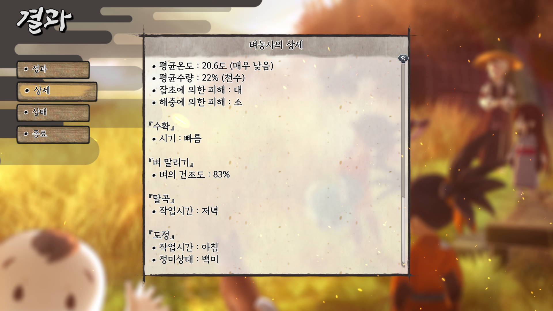 벼의 성장을 확인해볼 수도 있다. 벼는 향 / 양 / 맛 / 경도 / 찰기 / 윤기의 여섯 가지 능력치가 있으며, 무엇을 추구하냐에 따라 농사 방향성이 바뀐다. "올해는 맛을 중시하자, 작년엔 XX가 창궐했으니 저렇게 해보자." 같은 식으로...