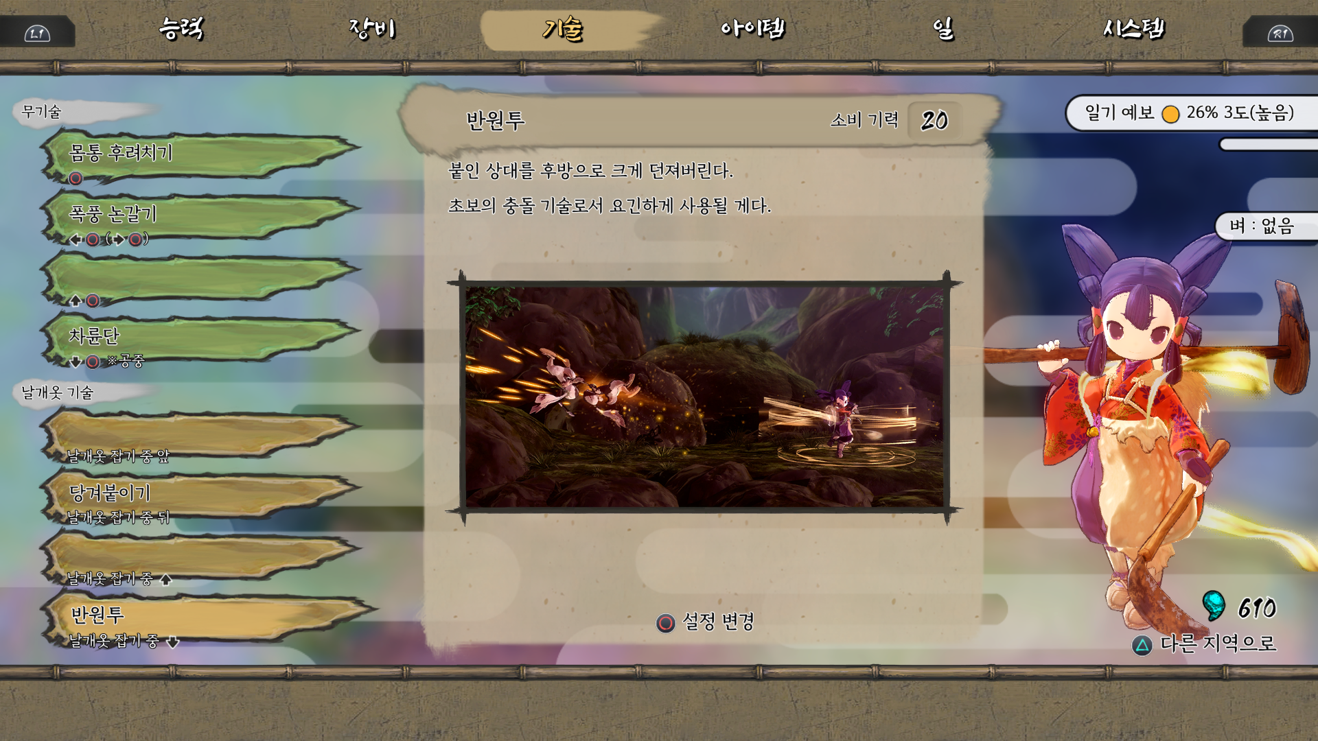'벼 농사'에 가려져서 그렇지, 의외로 액션이 재미있다. 간단한 조작으로 시원시원한 움직임이 가능하며, 패링이나 에어콤보 등 격투게임에서 따온 것 같은 개념들이 많다.