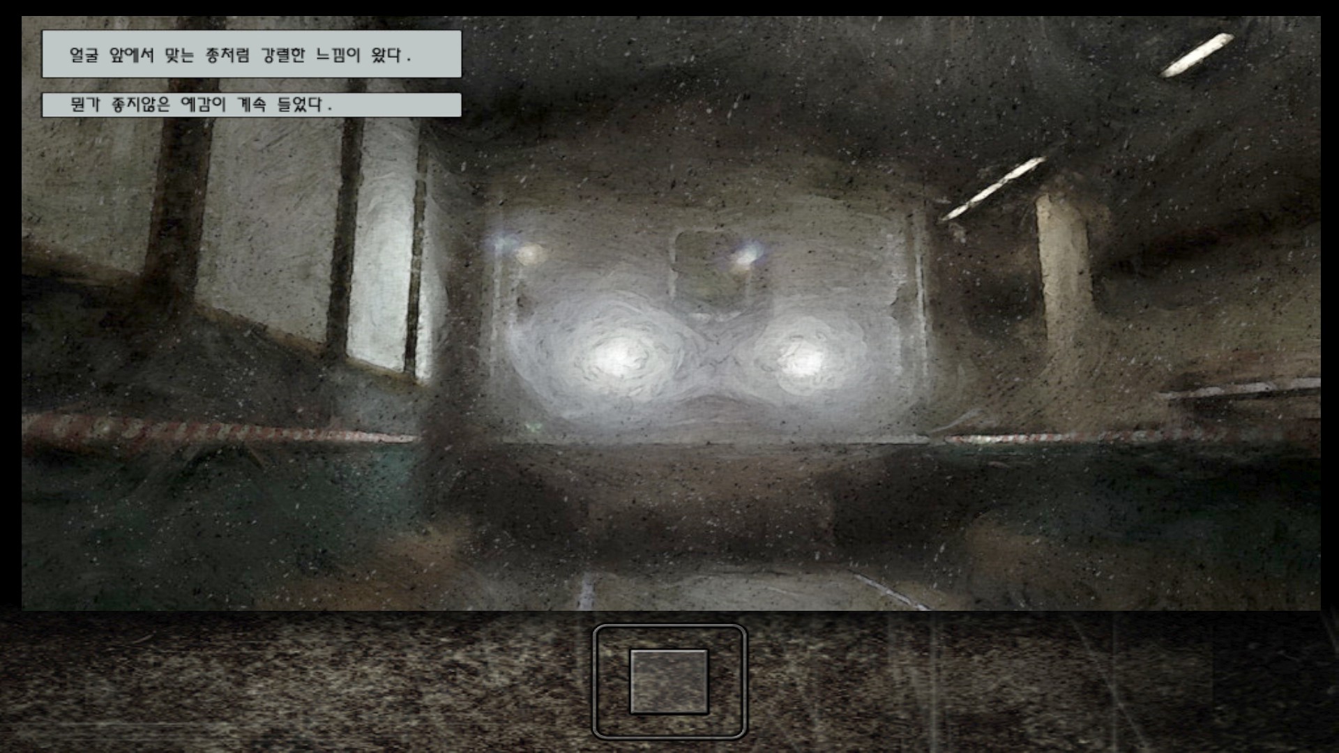 벽에 피로 칠갑이 되있고 느낌표 표시(빨간 원)가 떠있다.