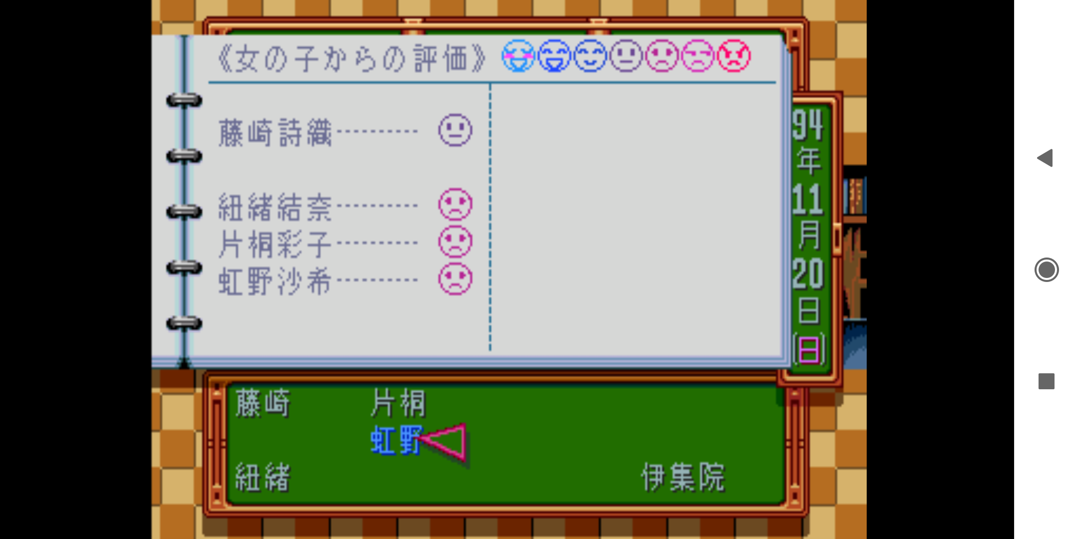 데이트 약속을 잡을 때 약속이 있다며 거절하는 경우를 심심치 않게 본다. 이 게임은 저장 타이밍이 적어, 재시도를 하려면 오래 전 데이터를 불러와야 한다. 피치 못할 상황이 아니면 세이브-로드 없이 쭉 진행하는 게 좋다. 전화를 하면 주말 일정을 소모한다. 데이트를 제안했다가 까이면 다음주에 다시 전화를 걸어야 한다. 연속으로 까이면 죽을 맛이다.